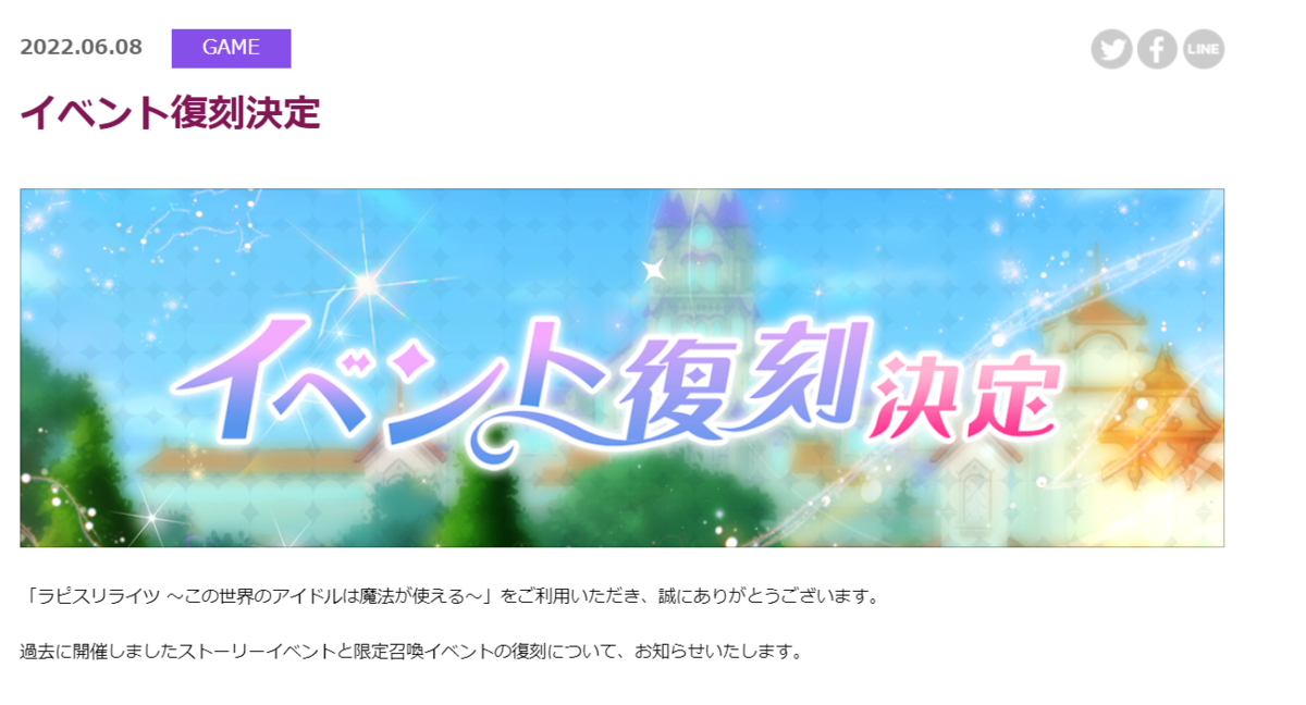「イベント復刻決定」。いやいや速すぎませんか?まだリリース半年ですよ?普通なら「新しいイベントやります!ジューンブライドイベントやります!」って息巻くタイミングなのに、もう過去のイベント復刻宣言(6月以降に開始予定)。