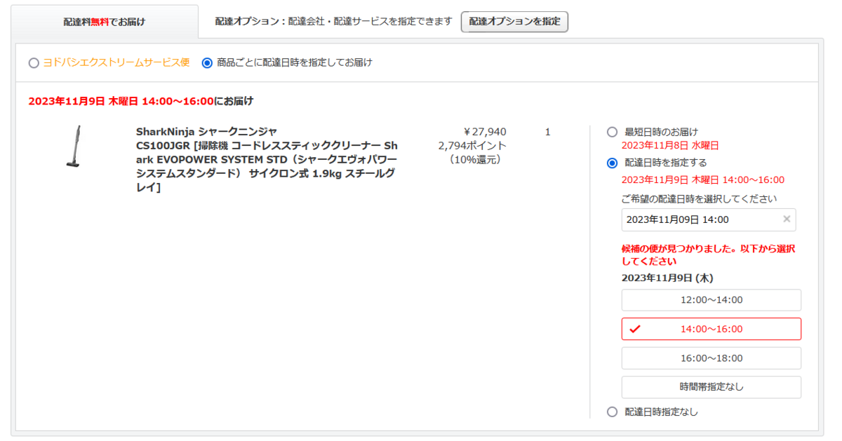 ヨドバシ.comで掃除機を買った。ヨドバシで購入すると、配送会社のデフォルトがヨドバシエクストリームサービスになる(対象地域・商品の場合)。これが厄介で、遅い上に時間指定もできない。